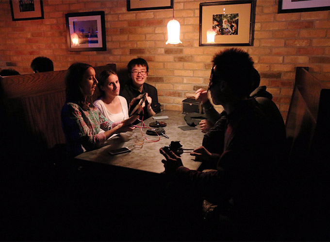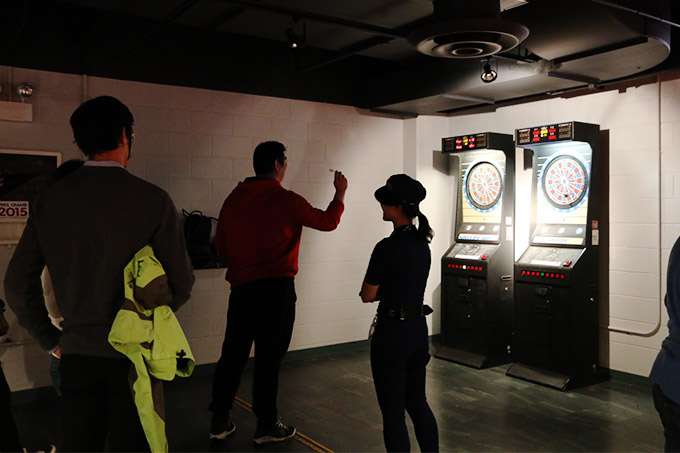 几名同学暂时离开舞池喧嚣,做投掷飞镖游戏