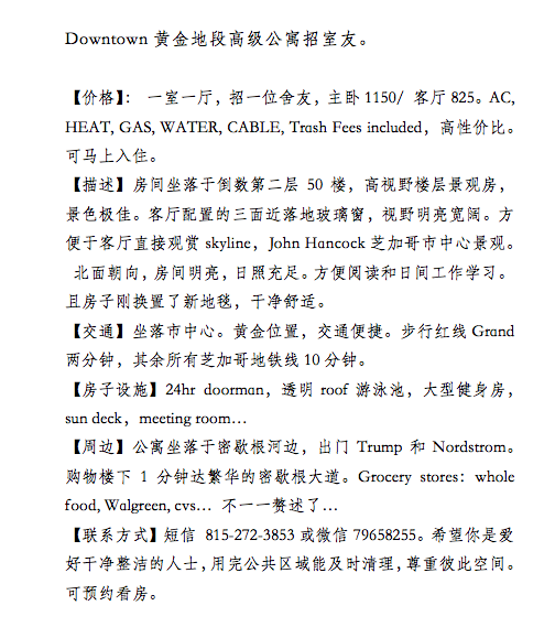 市中心黄金地段,高级公寓招舍友。顶楼高层景观房,一室一厅招室友。交通便捷,2分钟红线Grand站,10分钟内蓝棕粉绿橙线。十一月可马上入住,有意请联系 微79658255 谢谢。