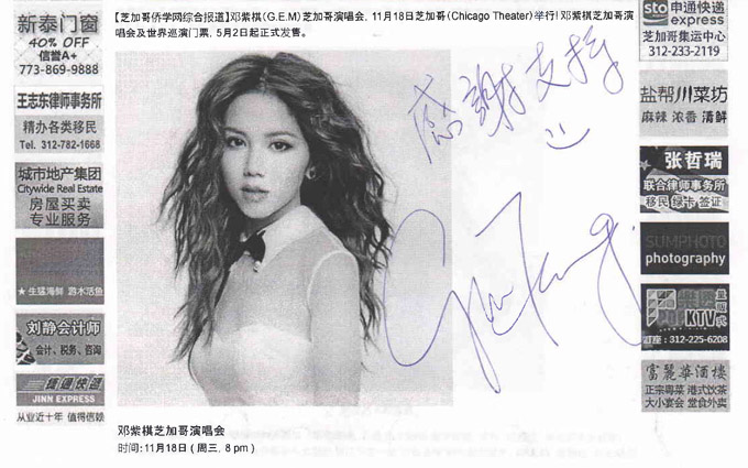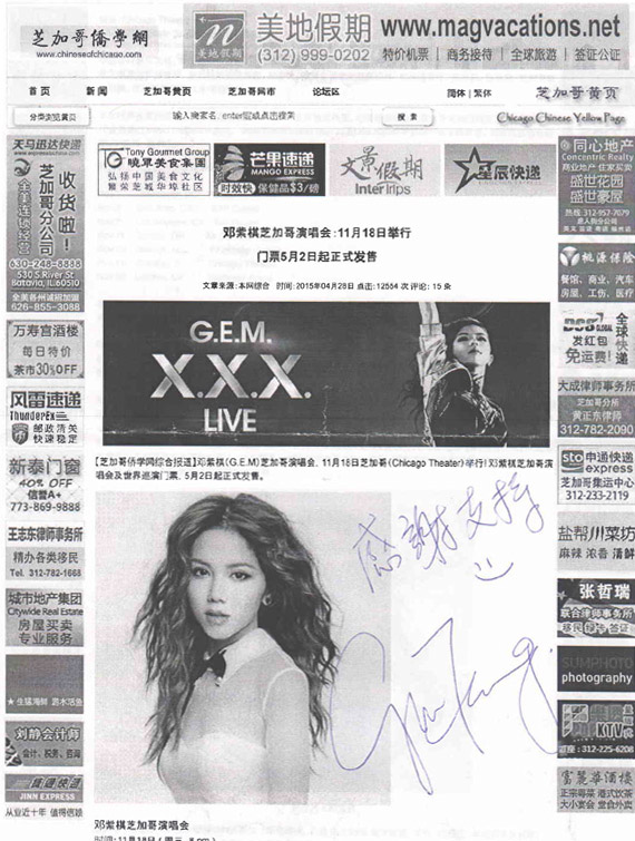 快讯】邓紫棋芝加哥演唱会,2015邓紫棋北美巡演的最后一站,11月18日芝加哥剧院(Chicago Theater)嗨翻天。《我是歌手》成名曲经典再现,新专辑新曲,吉他、钢琴、架子鼓,还有G.E.M 特有的爆发力歌喉,不拘一格的音乐风格,让芝加哥的歌迷们领略这位多才多艺、实力派歌坛红人的魅力。