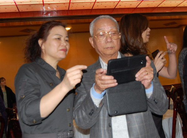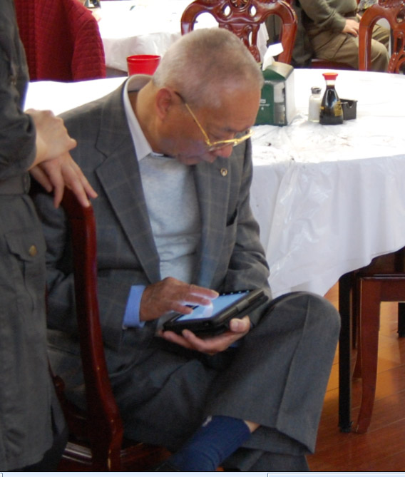 2011年4月11日,芝加哥同源会周年庆典,87街 Buffet City。庆祝大会上,发现社区德高望重之老侨领, 随身携带 ipad, 上网看报纸、查 email, 照相,样样精通,还手把手教导芝城社交名媛。有感而发,成打油诗一首: