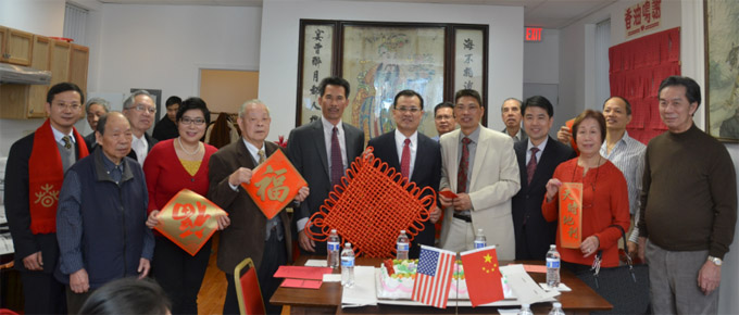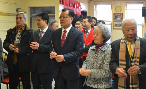 在伍胥山公所,赵卫平总领事一行入乡随俗,与该公所元老伍健生、主席伍健波等乡亲们一起,向伍氏先祖牌位上香行礼,气氛庄严隆重。全美伍胥山公所美东副总长伍换光表示,新春佳节之际,总领事一行的到来让伍氏宗亲备受感动,大家作为炎黄子孙,看到祖国日益发展强大,习近平党中央反腐败、推动一带一路战略均取得卓越成就,海外侨胞倍感荣耀,伍胥山公所今后与总领事馆保持密切联系,为祖国繁荣、侨社进步再作贡献。