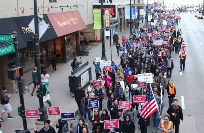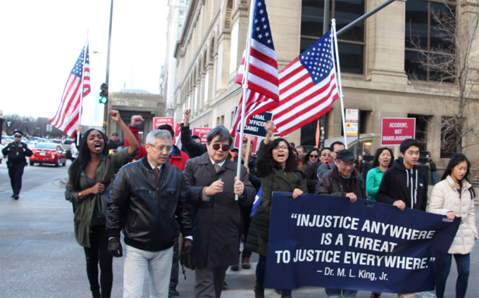 【芝加哥侨学网报道】芝加哥“援梁”大游行2月20日在市中心举行,5000多华人在市中心呐喊怒吼,声援纽约华裔警察梁彼得,指责陪审团歧视少数族裔警官,呼吁司法公正。这是一场与全美40多个城市同步举行的大游行,一场显示全美各地华裔社区团结的大游行,一场显示华裔维权意识觉醒的大游行,也是一场组织有序、和平理性的大游行。