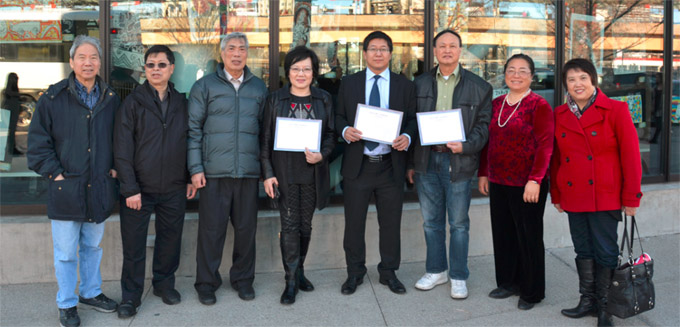 大用国际文化公司总裁蒋勇(右四)代表画展小作者们接受芝加哥社区侨领的褒奖