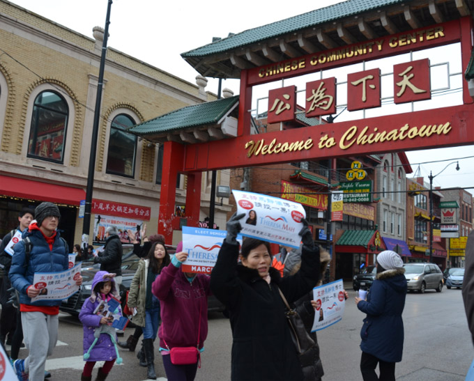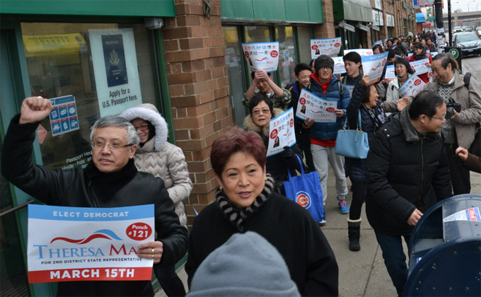 报道】伊州议会第二选区众议员华裔候选人马静仪(Theresa Mah),3月5日与她的支持者们一起在中国城参加”华人投票参政动员游行”。马静仪的支持者们沿街高呼口号,呼吁华裔选民投票支持马静仪,让伊州议会诞生首位华裔议员,共同创造华人参政的历史。