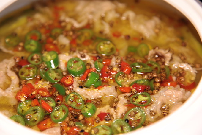 红红绿绿的小米椒映入眼帘,四川汉源的青花椒相伴左右,肉是选用上等肥牛,经过24个小时清水冲洗,达到去血腥,保鲜嫩的效果。把小米椒等佐料爆炒后加以芽菜粉丝和高汤熬制,最后加入肥牛,起锅前再淋上汉源青花椒油。一锅下来这肉是口感香嫩,汤是清儿不浊,汤底配有芽菜和粉丝也是入味三分。