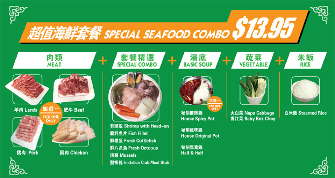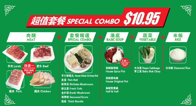 肉类(四选一) + 套餐精选+汤底(三选一)+蔬菜+ 米饭