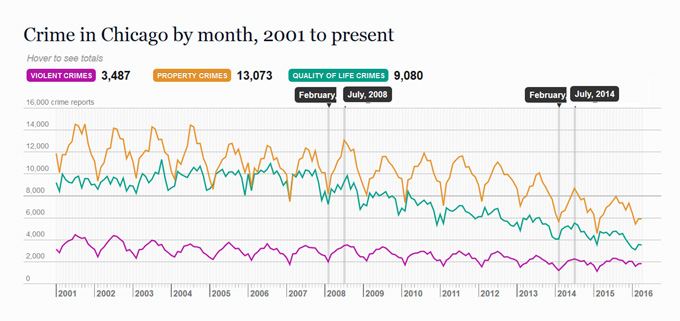 《芝加哥论坛报》的 “芝加哥犯罪”专栏, 积累了过去十年以来芝加哥的治安数据,并且每周更新芝加哥77个社区的犯罪数据。该专栏的数据显示,可以解答两个有关芝加哥治安的宏观问题:1,芝加哥什么时候最安全?2,哪里最安全?或者,反着问也行。总体而言,每年7月是芝加哥各类犯罪案件“巅峰时期”,每年2月则是罪案最少的月份(是的,罪犯也怕冷)。芝加哥治安最好的社区基本都是白人为主的社区,而治安最差的社区则全部为黑人居民超过90%的社区。