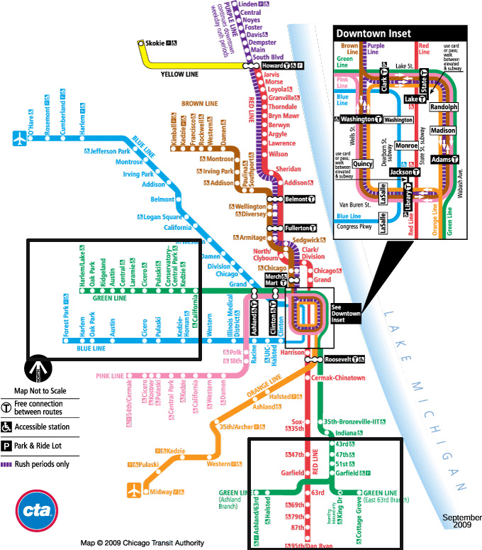 如果在芝加哥乘坐地铁,上图黑色方框标注的绿线、红线、蓝线区域,尽量避免。