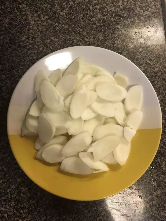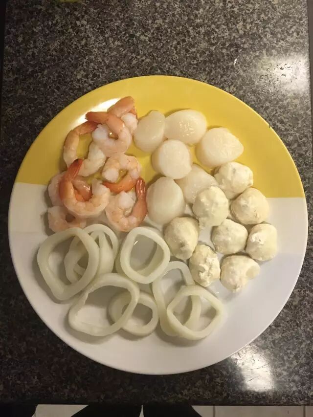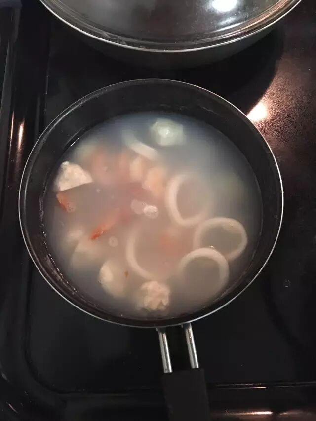 2)年糕、海鲜依次焯水(年糕焯水后再过一次凉水,可以使年糕口感Q弹)