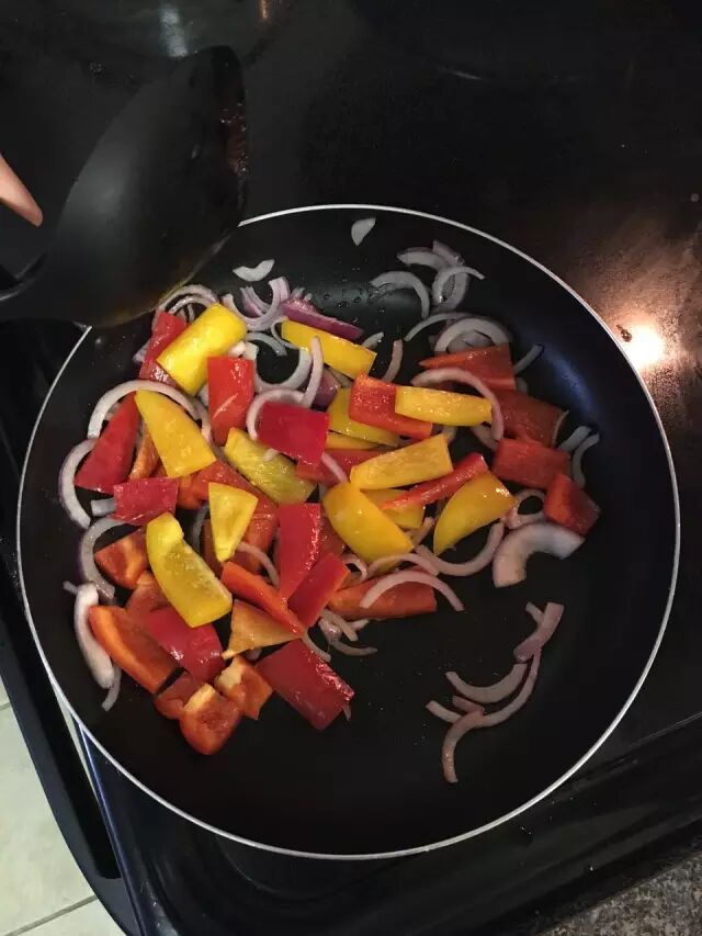 3)高火热锅,倒入适量食用油,热锅冷油翻炒洋葱和柿子椒至香味飘出。