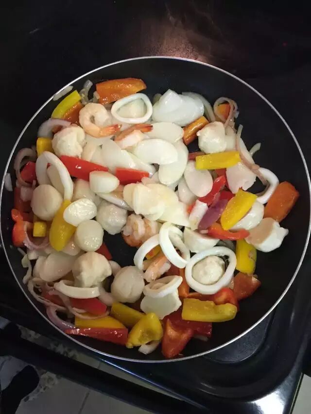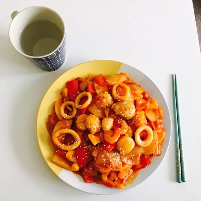 3 handful年糕,2个柿子椒(黄,红),一个洋葱,2tbs辣白菜,1 handful鱿鱼圈, 1 handful虾子, 1 handful扇贝, 1 handful墨鱼丸, 2tbs韩式辣酱,1tbs橄榄油, 1tsp食盐, 1/2tsp 白糖, 1/4tsp 鸡精,白芝麻