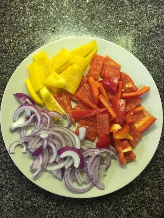 1)凉水浸泡15分钟解冻年糕、洋葱切丝,柿子椒切片,墨鱼丸对半切。