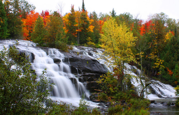 从酒店出发后前往邦德瀑布(Bond Falls)。在密西根北部密密麻麻的分列着大大小小上千个湖泊,但是瀑布却很少见。邦德瀑布的秋天是被枫叶环绕的时刻,潺潺的流水和五颜六色的枫叶给密西根的初秋增加了一份诗意。邦德瀑布旁边还有一些小的远足小路,我们可以在清晨沿着瀑布一路拾级而上,远离城市的喧嚣,尽情地呼吸新鲜空气。