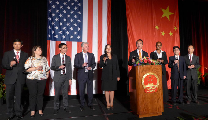 洪磊总领事与各界嘉宾敬酒贺国庆
