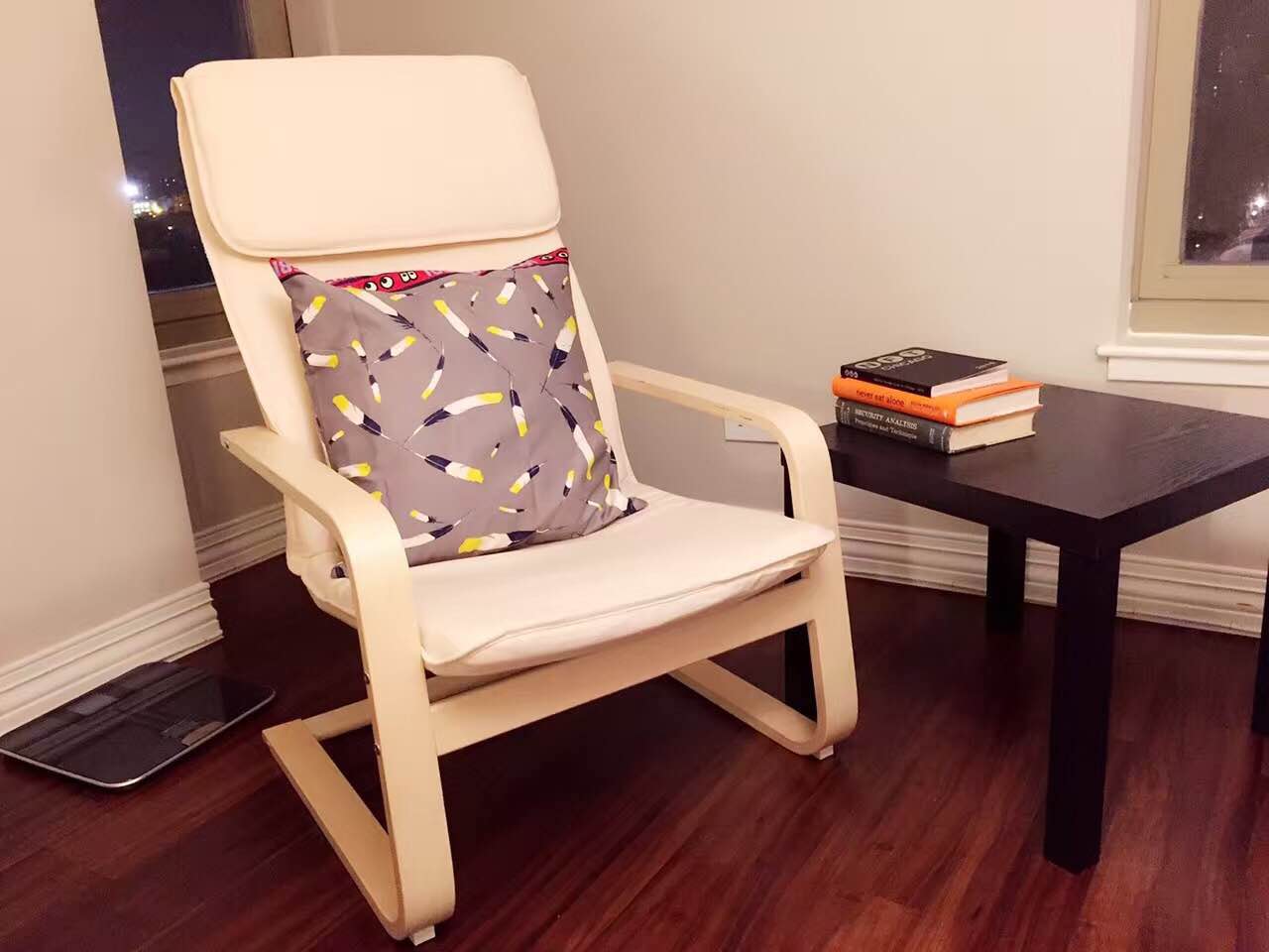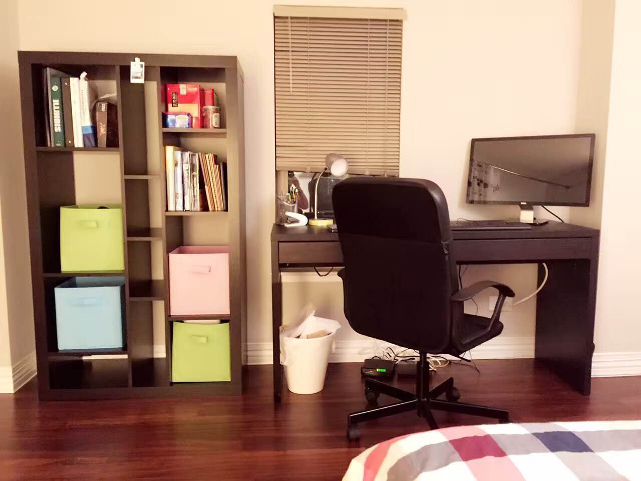房间情况: 房型中客厅开口很小,外加帘子遮挡有着足够密闭性。另房间有一张full size床,衣柜书柜写字桌床头柜加湿器一应俱全。同时还有24寸显示器和懒人沙发小方桌,门口处还有一个独立收纳间可收纳衣物和个人物品。