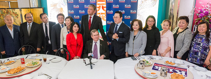 科克(Sen.Mark Kirk),10月6日来到位于芝加哥中国城内的翠亨村酒家,为其竞选连任造势。造势会邀请到了包括芝加哥地区华裔代表在内的多个不同亚裔群体代表的参与。马克  科克再次感谢了芝加哥亚裔社区尤其是华裔社区对他的支持。同时强调,将继续为促进芝加哥亚裔社区发展,加强中美合作做出努力。并承诺要将伊利诺伊州和芝加哥打造成北美“对华最友好”的目的地。伊州的未来属于亚裔!