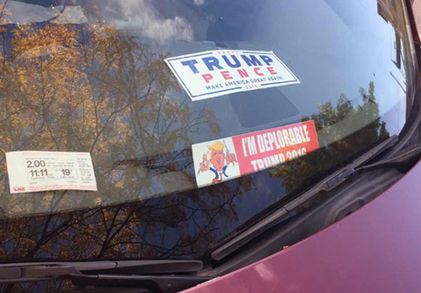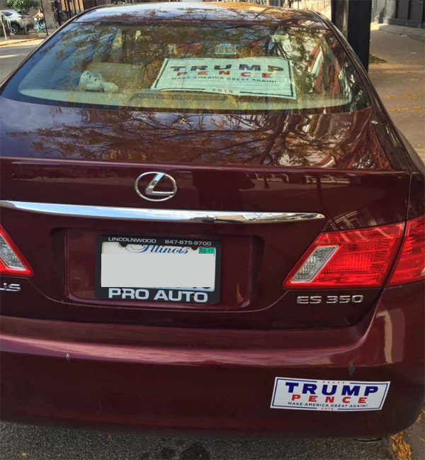 作为铁杆川粉,北美崔姐的工作车,车窗前,车尾保险杠都贴有支持川普的标语。她外出办事,就开着工作车,到处显示对川普的支持。这种“大无畏”的作法,结果是她的汽车在一个月前就无端出现了恶意的刮痕。北美崔姐认为这是希拉里的支持者所为,猛烈炮轰希拉里粉丝“很low”(此处省略N多字)。