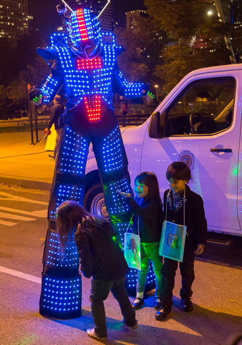 (芝加哥侨学网记者孙思航报道)由“文化一英里协会”(ChicagoCultural Mile)推出的2016万圣节聚会与游行,10月22日晚隆重登场。整场活动的重头戏,万圣节游行在夜幕降临后正式拉开大幕。芝加哥本地多家文化团体与组织派出了自己的游行队伍,尽情展示充满特色与创意的服饰与装扮。由50名芝加哥华人女性组成的旗袍女郎游行队伍,身着中国传统旗袍,手提中国灯笼。成为了当晚游行的一大亮点,为此次万圣节游行带来东方的性感与神秘。
