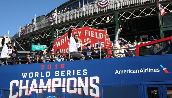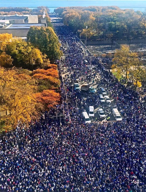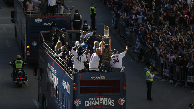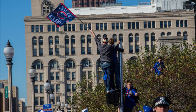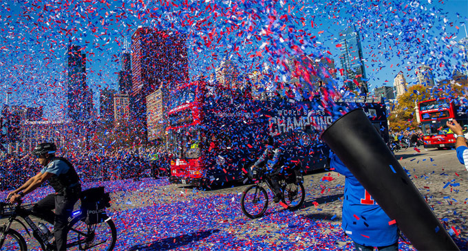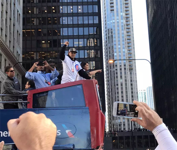 【芝加哥侨学网综合报道】11月4日,没有哪一个城市的人气旺过芝加哥。本周五庆祝芝加哥小熊队世界杯夺冠的庆功游行和集会,总共吸引了500万人,而芝加哥全市人口只有270万。芝加哥小熊棒球队(Chicaog Cubs)本周三在世界杯棒球锦标赛夺冠,打破了71年的山羊诅咒,是小熊队自1908年以来再次捧回世界杯。