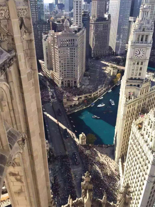 芝加哥河水染蓝,球迷们凌晨3时就到游行沿线占位,芝加哥标志性建筑装扮成小熊队的主题色彩,沿途球迷的狂热,小熊队队员的凯旋,一座城市的体育精神,在欢呼与礼花中史诗般绽放。