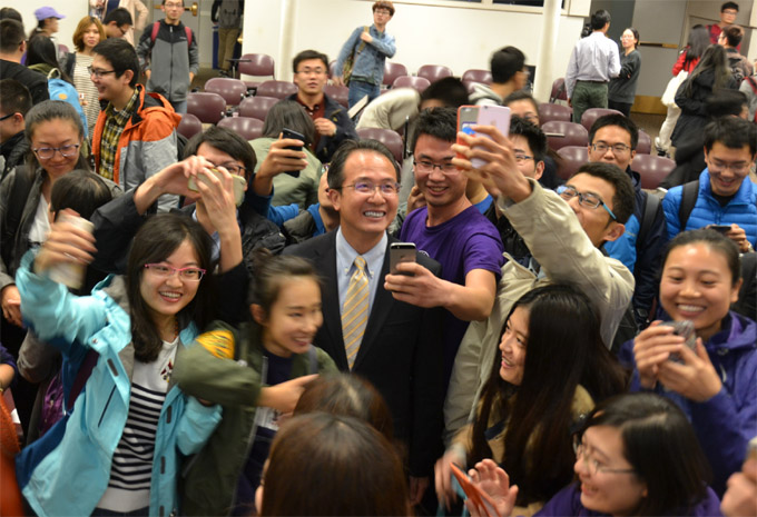 当天的公开课上,与会学子提问热烈。来自伊州大学芝加哥分校的一名中国留学生表示,他是党员,而他的班上有两名台湾留学生,在平时交往中该如何表明一个中国的原则、是否应该对他们进行统战工作? 对此,洪磊总领事表示,中国留学生来到美国,与来自台湾的留学生相处,与美国社会融合,这是一个舞台,洪磊总领事鼓励大家以更加自然、切近的方式,向来自海峡对岸的留学生,向美国社会现身说法,展现中国年轻一代的理想、理念、对国家的赤子情怀。