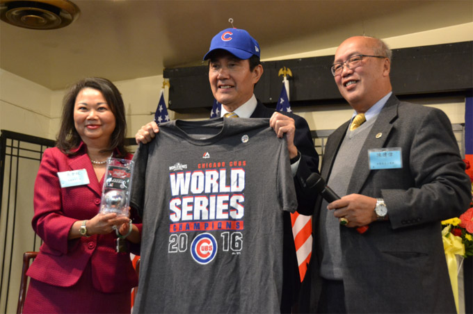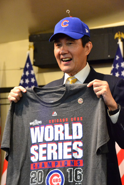 中华会馆向马英九赠送芝加哥小熊队夺冠T恤及球帽