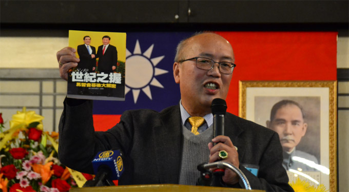 中华会馆董事长陈达伟,展示马英九赠书《世纪之握》