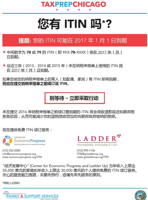 【芝加哥侨学网编译】2017年报税季已从本周一开始正式来临。芝加哥市政府提醒民众,今年退税将延迟发放,民众最早能收到退税的日期将在2月27日以后。同时,使用纳税人识别号码报税(ITIN)的民众,如果ITIN中间数字为78或79者,其号码将在今年元旦后过期,须在报税之前更新。否则,将会导致退税延迟或引起纳税或抵税额相关的争议。