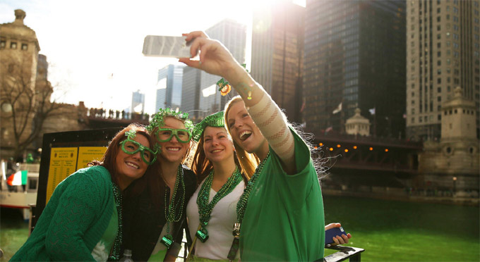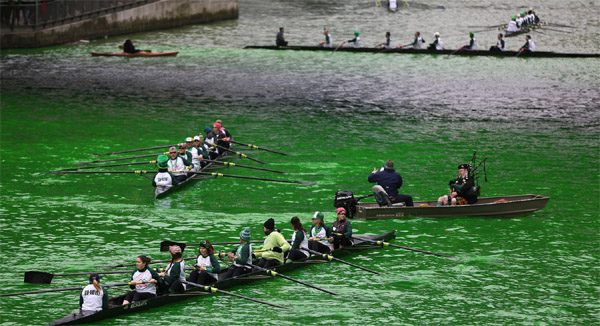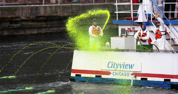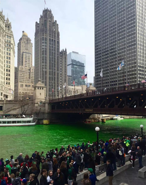 3月12日当天,数千人涌入芝加哥市中心,加入绿色节日的庆祝活动。自1962年以来,这座城市逐渐形成了许多有趣的传统来庆祝这个爱尔兰节日,其中最负盛名的当属染绿芝加哥河水这项大动作。据芝加哥论坛报的报道,巴特勒(Butler)和罗文(Rowan)两个家族负责染绿河水这项工作已经超过50年了,对他们而言,圣派特里克节更像是一个家族大聚会。