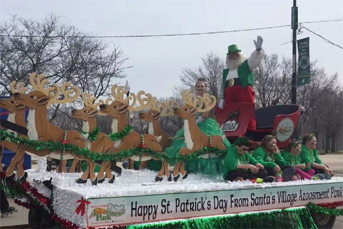 在河水染绿之后,欢乐才刚刚开始,一年一度的圣派特里克节在市中心格兰特公园举行。包括伊利诺伊州长朗纳(Bruce Rauner),芝加哥市长伊曼纽尔(Rahm Emanuel)、伊州议会议长迈克麦迪根(Michael Madigan)这些伊州政坛重量级人物都参加,他们身着绿色元素的服装列成一队,在哥伦比亚大道(Columbus Drive)加入庆祝游行的队伍,并亲切问候两边围观游行队伍的市民。