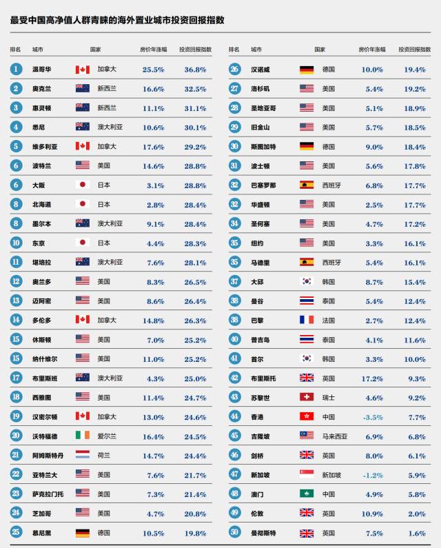全球房价指数前50名排行榜,美国只有6所城市入围,分别是: