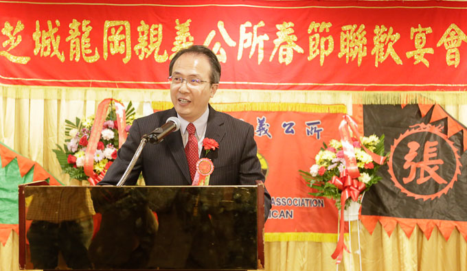 驻芝加哥台北经济文化办事处处长何震寰致辞并向在场来宾拜年。何震寰处长表示,龙冈亲义公所是芝加哥著名侨团,他们传承了三国演义中最重要的“团结,忠义,相互扶持”的美德,这是全球华人都推崇的美德。何震寰处长指出,今天看到芝加哥各界的华侨,华人代表都来参加春宴,正是体现了这样“精诚团结”的精神,十分开心。最后,何震寰处长由衷的感谢了龙冈亲义公所在过去一年来为团结侨团,服务侨社所作出的贡献。