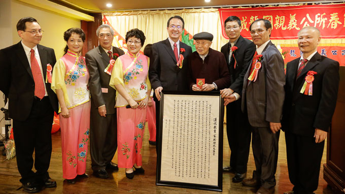 龙冈亲义公所全体职员与驻芝加哥台北经济文化办事处处长何震寰合影