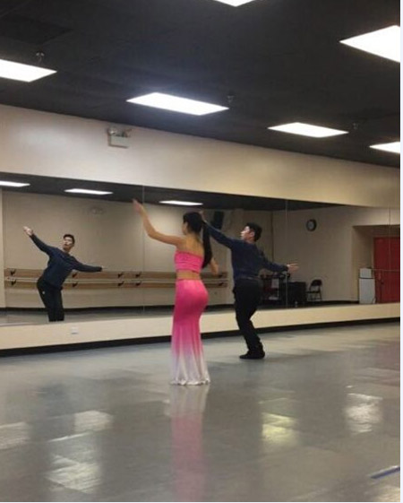 多多对”花儿“一见钟情,看过一遍录像就马上跟着自学上了。虽说她从三岁就开始跳舞, 国标舞,踢踏舞,现代舞和芭蕾舞都学过,可多多的中国舞基础不深, 很长时间她以为自己最喜欢的是现代舞。 当时离预赛已经不到三个月了, 为了让多多尽快掌握傣族舞的技巧,吕皓老师一边忙着给多多定制演出服装, 一边又从网上搜来各种各样的傣族舞教学视频给多多在家里练习, 同时在课堂上从手指手腕,头颈肩背,步幅步频,从孔雀到花儿到傣族窄裙,一个一个细节耐心地讲解,示范,纠正。