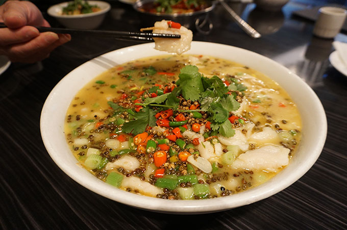重庆酸菜鱼:选用 新鲜活鱼 以及三种来自四川的辣椒和花椒 鱼的肉质鲜嫩多汁 麻辣与鲜辣的碰撞 汤汁中的粉丝及其入味