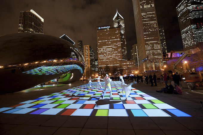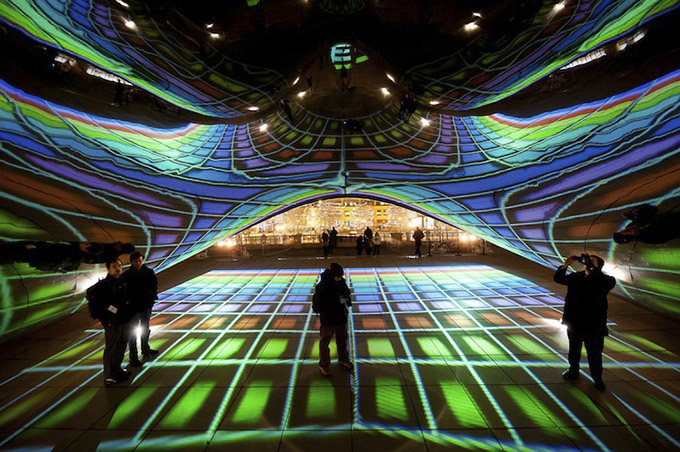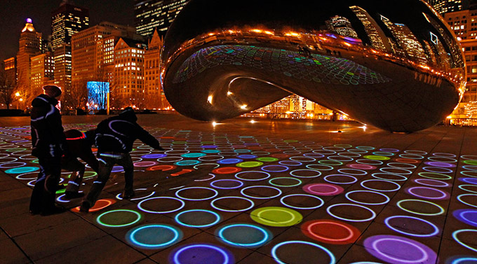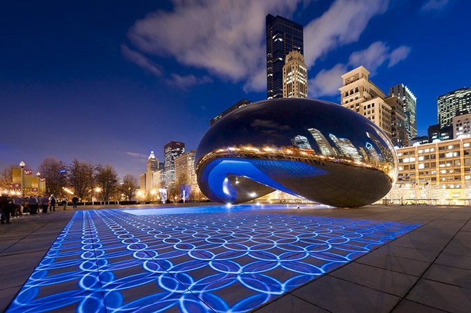 其实类似的城市光影秀在芝加哥早已有过先河。2012年由本地艺术家LuftWerk创意团队利用光线、幻灯机,和锵铿有力的打击乐,精心布置了一场千禧公园”大豆子“声光秀,取名“Luminous Field ”(闪耀之地)。艺术家将霓虹几何形状和颜色网格投射在高度抛光的“大豆子”上,结合音乐与各种表演,让灯光秀将“大豆子”真正变成了一个通往奇特世界的”云门“(Cloud Gate)。