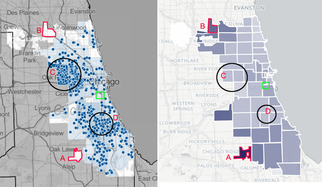 C处包括全芝加哥拥枪率最低的North Lawndale社区,以及接近最低拥枪率水平的Austin社区。