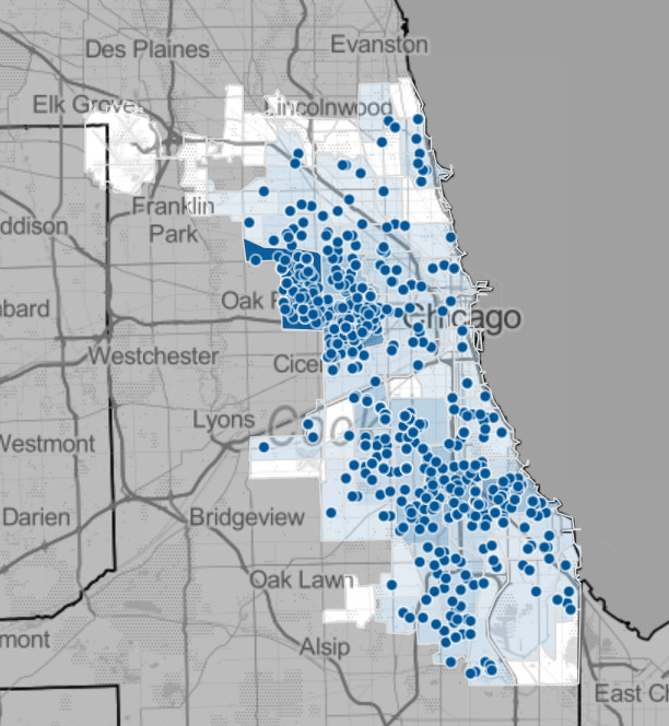 左图:2017年以来芝加哥市的枪击案统计(截止3月18日),点点越多,枪击案越多,空白区域为尚无人遭枪击( Chicago Tribune )