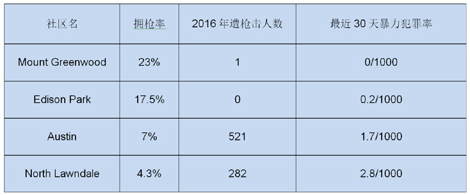 芝加哥西城区的北诺恩戴尔社区(NorthLawndale),4.3%的拥枪率全市最低,但2016年社区遭枪击人数第二多,暴力犯罪率全市第二高(2.8/1000)。同在西城区的奥斯汀社区(Austin),仅7%的拥枪率,2016年遭枪击人数全芝加哥最多,暴力犯罪率1.7/1000。相反,芝加哥南城区唯一白人占多数的社区蒙特格林伍德(MountGreenwood),23%的拥枪率全芝加哥最高,2016年该社区仅1人遭枪击,暴力犯罪率0/1000。西北城区的艾迪森公园社区(EdisonPark),17.5%的拥枪率芝加哥第二高,2016年该社区无人遭枪击,暴力犯罪率0.2/1000。