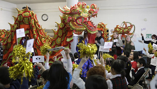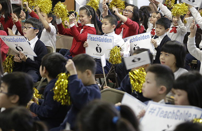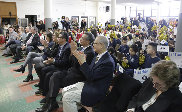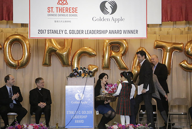【芝加哥侨学网记者孙思航报道】南华埠圣德力小学(St. Therese Chinese Catholic School )校长卡瓦隆(Phyllis Cavallone)荣获2017年“金苹果”杰出教育家大奖(Stanley C. Golder Award for Excellence in Leadship)。3月23日圣德力小学全体师生与各界来宾在学校体育馆内为校长卡瓦隆举行了一场惊喜万分的奖仪典礼。
