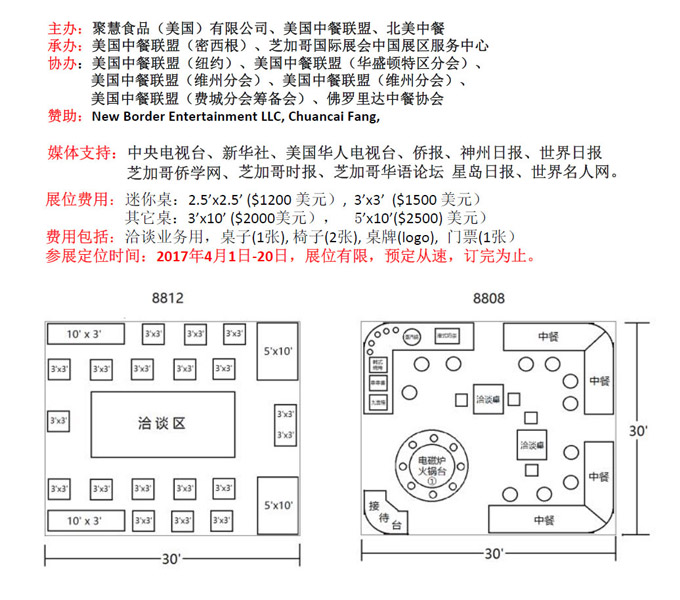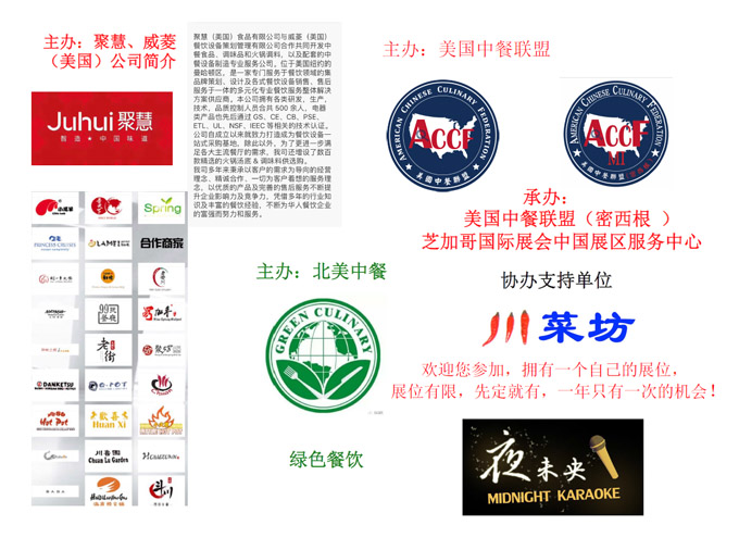本届会展将在著名的麦科米克会展中心举行,会展的中餐中国区是由北美中餐协会、美国中餐联盟、聚慧食品(美国)有限公司联合主办推出,将包括中餐企业展示区、现场咨询服务中心。