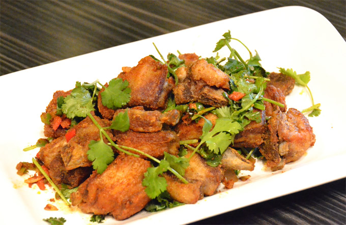 农场有机饲养的山羊,取羊排,放入秘制香料与多种滋补药材的汤水中慢炖入味,吸收精华,而后捞起,大火干炒,加巴国天府自制椒盐粉,出锅盛盘,咬一口,外焦内嫩,酥脆与汤汁感,层次分明。