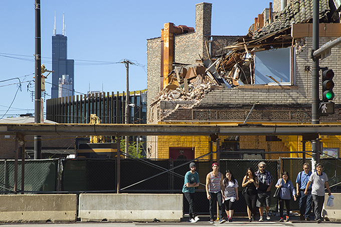 摄于2015年,一位华人老者穿过马路,背后的建筑要被拆除(杨子豪原图片说明)