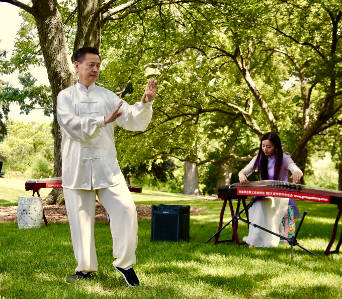 关孟华老师与来自芝加哥文化村的特邀嘉宾郭进先生表演古筝与太极《梅花三弄》,舟微月对枫林,分付鸣筝与客心。