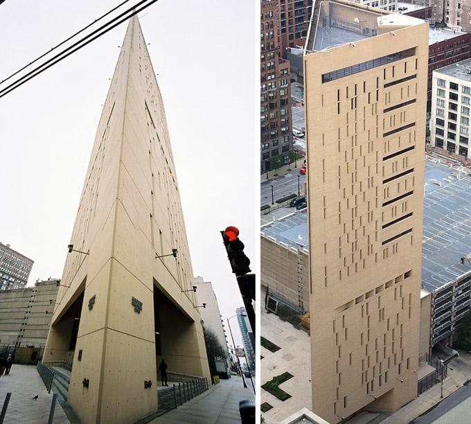 芝加哥侨学网编译】作为建筑之都的芝加哥,市中心有一栋很奇怪的三角形大楼,大楼没有窗户,只有一条一条的狭窄通风口。这栋奇怪的建筑就是大名鼎鼎的联邦监狱“大都会劳改中心”(Metropolitan Correctional Center)。监狱对面的停车场顶层,脱衣舞表演则成为囚犯们远程享受的娱乐项目。