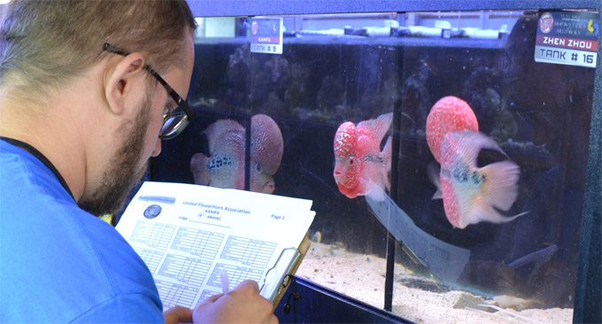 这场别开生面的选美比赛,是由“美国花罗汉协会”(UFA)主办,金鱼水族街协办。UFA对参赛花罗汉鱼在体型、色彩、长度等方面有着严格的规定,在经过UFA评审委员会的评估之后,共有来自芝加哥市,伊利诺伊、威斯康辛、密苏里等州的16位花罗汉饲主们参与。