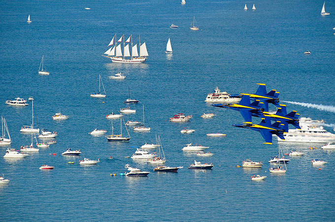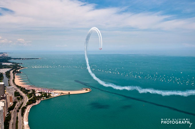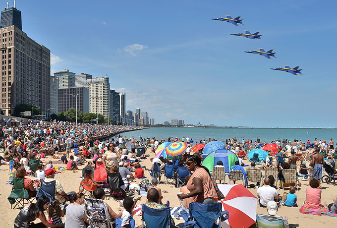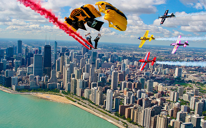 一年一度的芝加哥海空表演,是全美规模最大的免费飞行表演秀,从1959年开始,至今已有58年悠久历史。本届海空表演是有芝加哥市政府、壳牌石油公司联合推出,包括美国海军蓝天使特级飞行队(The U.S. Navy Blue Angels)在内的多支美国军方顶级表演队伍的飞行表演和多样的民间飞行表演将成为表演的重点。对于军迷来说,第五代战机F-22猛禽,A-10雷霆二式攻击机,AV8攻击机等美军空军飞机也会悉数亮相,上天表演。