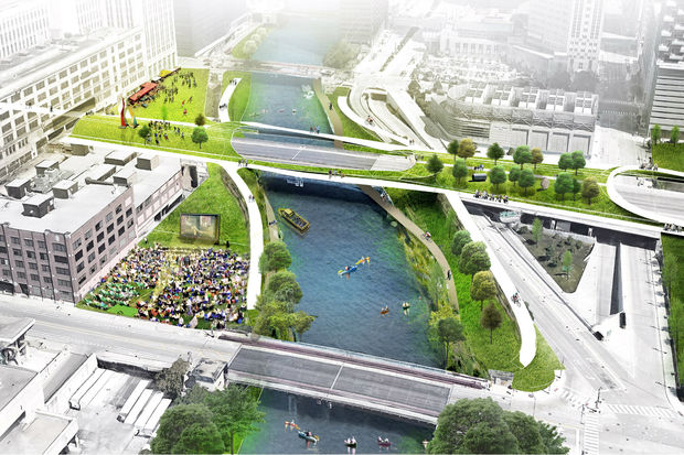 由著名的建筑设计公司Studio Gang提交的这项创意设计,为市中心国会大厦大桥区域带来都市的绿色小清新。大桥街道部分区域由绿色植被覆盖,有用于播放露天电影的绿色草坪区域,还有休闲小道。