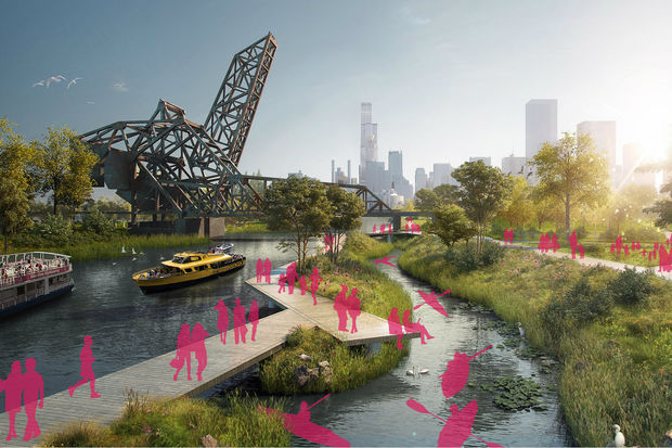 位于中国城谭继平公园的圣查尔斯铁桥区域,由SOM公司提供的创意设计特别引人注目。增加绿地面积,在河畔与河上均有休闲小道的设计。