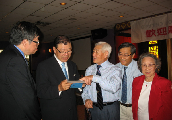 2009-8-20 申佩璜處長、袁健生駐美代表、容樹藩前副會長、邢華漢前會長、容夫人吳瑞麟於富麗華中華會館主辦歡迎袁健生大使為莫拉克颱風八八水災募捐餐會。(圖片:芝加哥榮光會)
